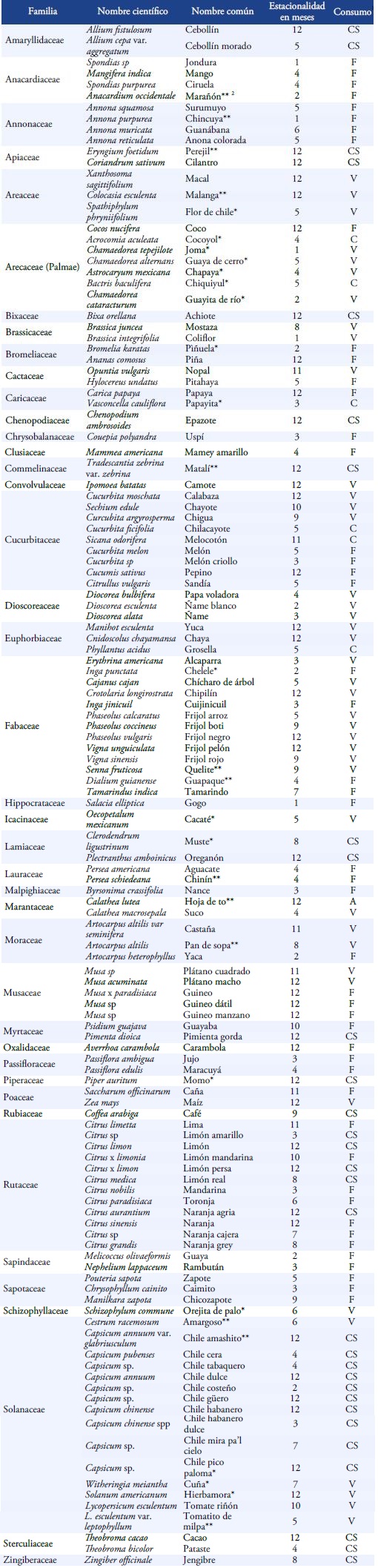 En total, se acumularon 126 especies en el año y por su grado de manejo, el 78.6 % (99) son cultivadas, 12.7 % (16) son silvestres colectadas, y el 8.7 % (11) restante, además de colectadas, empiezan a tener un grado de manejo por la demanda de los consumidores. En el Anexo 1 se enlistan estas especies describiendo la familia a la que pertenecen, los nombres científicos y comunes. La estacionalidad y el consumo reportado por los entrevistados.