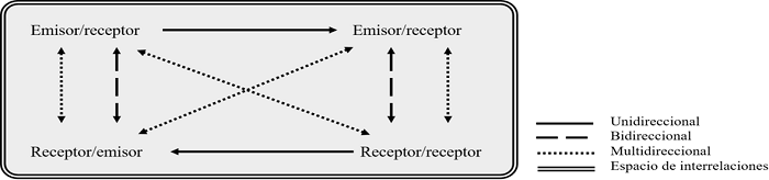 Dichas prácticas espaciales son posibles debido a los mecanismos de comunicación que se promueven en los espacios y que, en consecuencia, permiten las relaciones interpersonales. Los mecanismos accionan diferente uno de otro en lo que se refiere a las maneras de relacionarse y por medio de ello, generan aprendizaje y conocimiento. Estas formas pueden ser unidireccionales, bidireccionales o multidireccionales. La comunicación unidireccional es un proceso de persona a persona sin retroalimentación, como sucede en los medios tradicionales de comunicación masiva, como la televisión, la radio, el cine, la prensa y similares (López, 2005); la comunicación bidireccional, hace referencia al carácter activo del receptor pues en éste sí existe la retroalimentación, ya sea de forma verbal o no verbal (López, 2005), como se ejecuta en la convivencia intergeneracional, la práctica, la academia y los grupos organizados, donde se fomenta la interacción persona a persona; y la comunicación multidireccional se caracteriza por la interacción de diversos usuarios entre sí, quienes pueden ser emisores y receptores a la vez, en un ambiente en el que los participantes emiten sus opiniones/conocimientos/experiencias hacia el tema en la mesa (López, 2005). Aquí, se incluye a mecanismos como la convivencia intergeneracional, la práctica y la participación con grupos organizados, pero también hay que incluir a redes sociales como WhatsApp y Facebook pues permiten la interacción entre quienes los usan.