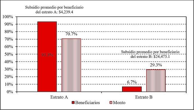 El tamaño de la UPP medido en superficie del predio, osciló entre 0.1 y 1,000,000 hectáreas, con un tamaño medio de las UPP a nivel nacional de 236 hectáreas. Se advierte que 46 % de las UPP tienen entre una y 15 hectáreas de superficie ganadera; 32 % cuenta con una superficie que va de 16 a 50 hectáreas. Las UPP que tienen entre 51 y 200 hectáreas representan 14 %. Sólo poco menos del 8 % de las UPP detentan más de 200 hectáreas, confirmándose el apoyo principal a productores de baja escala. Al estimar el monto promedio de apoyo por beneficiario, destaca que los beneficiarios del estrato B reciben 5.8 veces más en comparación con los del estrato A, lo que relativiza lo referido en los dos párrafos anteriores, el Progan muestra cierto grado de regresividad (Gráfica 3).