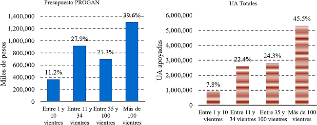 El promedio de UA por UPP beneficiada a nivel nacional fue de 33.6, con un rango de entre uno y 9,008 UA, resaltando que se apoya a un máximo de 300 UA por UPP. Al estratificar con mayor detalle las UPP por número de UA apoyadas se observó que 42 % se concentra en el rango de 1 a 10 UA; poco más del 38 % con 11 y hasta 34 UA. En menor proporción (14.7 %) están las UPP con entre 35 y 100 UA; sólo 5 % de las UPP tiene más de 100 UA apoyadas por el Progan. Se pone de relieve lo que se puede considerar como una adecuada focalización de la población objetivo, al privilegiar a los ganaderos de menos ingresos.