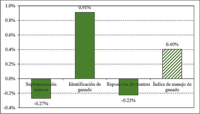 Este índice representa una medida sintética de análisis de la mejora en el manejo del ganado en la UPP y, valora tres variables: identificación de ganado, suplementación mineral y fertilización de vientres. La identificación de ganado en la UPP fue uno de los compromisos de los beneficiarios y parte de la estrategia de ordenamiento del Progan. Se encontró que 94 % de los beneficiarios reconoció que el ganado apoyado tiene arete o placa (colmenas) de identificación del Sistema Nacional de Identificación Individual de Ganado en México (SINIIGA), aunque 60.4 % de esos beneficiarios declararon que el ganado no apoyado no tiene el identificador del Componente y 10.4 % declaró que su ganado no tiene ningún tipo de identificador, lo que muestra que este compromiso solía cumplirse para recibir el apoyo, pero sin incluir a todo el hato. Las bondades de la identificación son relevantes para el control del inventario nacional y su gestión dentro de las UPP, por lo que se tendría que intensificar esta práctica y abarcar al máximo de animales.