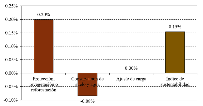 El Índice de conservación y recuperación de recursos naturales se diseñó para estimar el grado de adopción de prácticas de protección y/o revegetación en la UPP del beneficiario. Su cálculo incluye la medición en hectáreas bajo las siguientes prácticas: impedir corte de árboles/arbustos; evitar uso de fuego; reforestar; sembrar herbáceas, arbustivas o cactáceas; y otras prácticas especificadas por los beneficiarios. Los resultados de este índice denotaron un crecimiento de apenas 3 % entre los dos años comparados, dado que los ganaderos están apegados históricamente a sistemas extensivos, aprovechando la renta del suelo en lo que Chauvet (1999) ha denominado como la ganadería extractiva. Los avances se sustentan en la incorporación de prácticas de manejo de agostaderos en beneficiarios de bovinos carne y doble propósito principalmente. En efecto, el 68 % de los entrevistados reconoció su vínculo a los recursos naturales y reportaron la incorporación de 33 hectáreas en promedio al manejo sustentable, que es un valor apreciable pues en una expansión al total de beneficiarios del Progan significaría entre 12 y 14 % de las tierras de agostadero del país. Sin embargo, no se puede argumentar sobre la efectividad y sostenibilidad de estas prácticas de los ganaderos en sus terrenos.