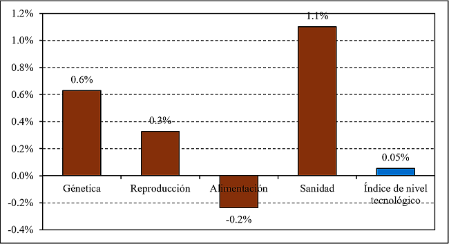 El cambio tecnológico considera cuatro subíndices respecto a: mejoramiento genético, manejo reproductivo, suplementación alimenticia y mineral y control sanitario. Este indicador también revela una modificación apenas perceptible de 0.05 % (Gráfica 7), que se debe a aspectos sanitarios (que a menudo los productores los han atendido por efectos de campañas sanitarias y por exigencias de mercado) y a mejoras en genética, temática en la cual poco ha incidido el Progan. En menor medida han influido los cambios en reproducción y alimentación (en este último caso, ligeramente negativo, aunque como se revisó previamente es un tema en el cual los beneficiarios han mostrado un nivel medio alto). Esta evidencia muestra que una política de apoyos directos posee posibilidades acotadas para inducir el cambio tecnológico, que suele implicar inversiones en las UPP y, en particular va en contra de una ganadería extensiva basada en bajos niveles de inversión.
