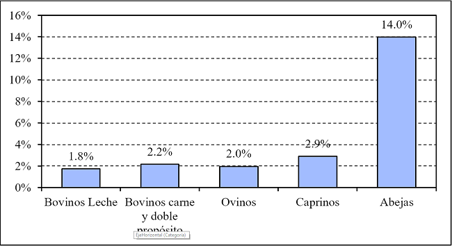 Los rendimientos se estimaron según el sistema producto de las especies apoyadas, a saber: crías por hembra en edad reproductiva/año; número de animales finalizados por año respecto al total del hato, litros de leche por vaca/año y el volumen de miel/colmena/año. En los casos de sistemas con dos productos se obtuvieron promedios ponderados para los mismos (cría-leche, por ejemplo). Los cambios de rendimientos en los dos años de análisis fueron desde 1.8 % en bovinos leche hasta una tasa de 14 % en abejas. El primer valor resulta modesto, pero se trata de productores exclusivamente del estrato A, con dificultades de acceso al mercado, dadas las exigencias en cuanto a calidad de leche. En el caso de la miel, los beneficiarios por lo general son tradicionales, con bajo nivel tecnológico, con rendimientos promedio reducidos, por lo que cualquier aumento tiende a ser volátil, que quizá explica este significativo cambio de rendimiento.