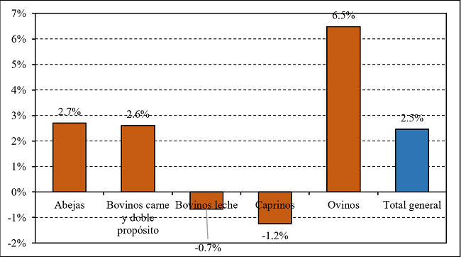 En rendimientos de miel y bovinos doble propósito se estimaron incrementos de 2.7 y 2.6 % respectivamente, que se deben a los mayores precios que han reportado productos como miel y becerros en el último año de análisis respecto al primero. En ovinos el aumento es importante, de 6.5 % en los dos años considerados, debido a la alta demanda de carne de esta especie, especialmente para abastecer canales comerciales en franco crecimiento como el de la barbacoa, el cual históricamente ha carecido de una oferta suficiente.