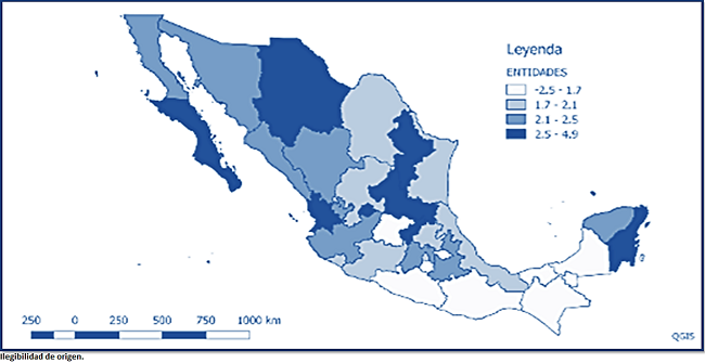 En segundo grado de distribución de la tasa media de crecimiento de la actividad económica se encuentran a estados como: Jalisco, Yucatán, Durango, Baja California, Sonora, Puebla, Sinaloa y el Estado de México, los cuales han crecido por encima de la media nacional (2.04 %) entre un rango de 2.1 y 2.5 por ciento.