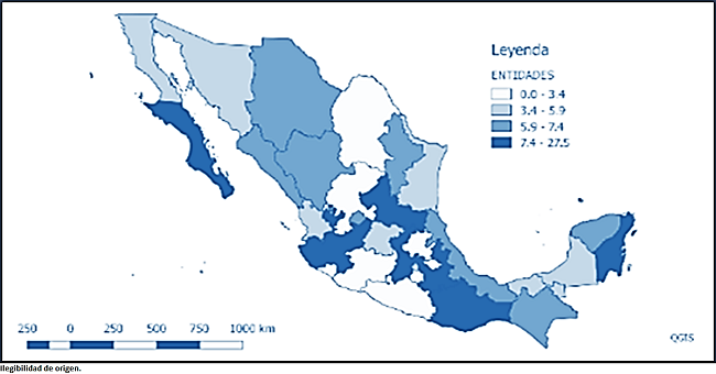Por su parte, el color gris claro y blanco representan a los estados con tasas medias de crecimiento por debajo de la media nacional. El Mapa 2 muestra que los estados con mayor tasa media de crecimiento anual del tráfico de pasajeros aéreos son: el estado de México seguido de Querétaro, Puebla, Quintana Roo, San Luis Potosí, Baja California Sur, Oaxaca y Jalisco, ya que crecen entre 7.4 y 27.5 por ciento. En la segunda parte de la distribución se encuentran ha estados como Nuevo León, Chiapas, Yucatán, Durango, Chihuahua y Sinaloa los cuales crecen entre 5.9 y 7.4 por ciento.3