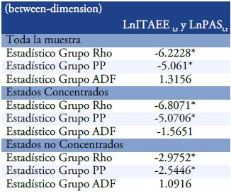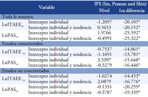 Se aplicó la prueba IPS para determinar el orden de integración de las series. La Tabla 1 muestra que todas las series son no estacionarias en niveles por lo que fue necesario aplicar una diferencia con lo que se confirmó que son I (1).4