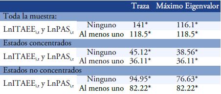 Adicionalmente, se estimará la prueba de cointegración de Johansen (1990), con el fin de obtener resultados más robustos sobre la relación de largo plazo que se pueda presentar entre variables. La prueba de Johansen (1990) contrasta la existencia de múltiples vectores de cointegración entre las variables, mediante la prueba de la Traza y del máximo Eigenvalor. Ambas pruebas contrastan la hipótesis nula de que no existen vectores de cointegración, es decir, que no hay más de r relaciones de cointegración, frente a la hipótesis alternativa de que el número de ecuaciones de cointegración es estrictamente más grande que la r asumida bajo la hipótesis nula.