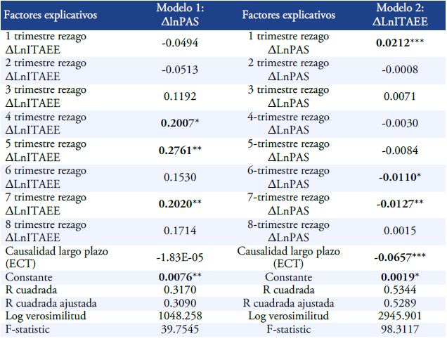 El coeficiente Bit (ECT) para el primer modelo resulta ser no significativo, lo que indica que el crecimiento económico (ITAEE) no produce efectos de ajuste en el largo plazo sobre el número de pasajeros transportados por vía aérea (PAS). Sin embargo, en el corto plazo sí se producen efectos a partir de los rezagos 4, 5 y 7 (valores resaltados en negritas en el modelo 1). Es decir, que un aumento en la actividad económica produce efectos sobre la demanda de transporte aéreo de pasajeros después de un año.