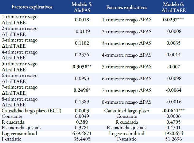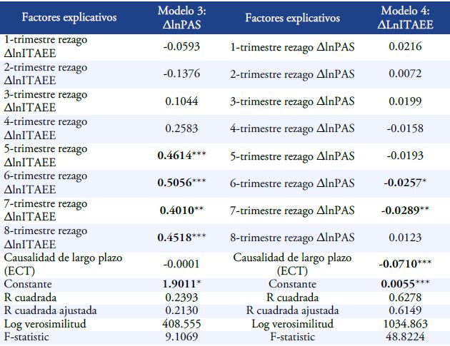 El término de error que se desprende de la prueba de cointegración, se interpreta como el desequilibrio o las distorsiones que se presenta entre las series en cada periodo de tiempo. Tomando como referencia dicha perturbación, el VECM corrige dicha distorsión y estima la tendencia de ajuste que se produce en cada serie para restablecer el equilibrio. Además, mediante el ajuste del error el VECM permite distinguir entre la relación de corto y largo plazo entre variables. Siguiendo el trabajo de (Hakim y Merkert, 2016) la construcción del VECM con las variables de ITAEE y PAS se puede expresar como: