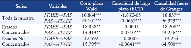 Los resultados de la prueba fuerte de causalidad de Granger presenta resultados muy parecidos a los desarrollados en el corto plazo. Los coeficientes son significativos a nivel de 5 % para el total de Estados y los Estados Concentrados, sugiriendo una relación causal bidireccional. Por lo que sugieren que el crecimiento del tráfico aéreo de pasajeros conduce al crecimiento económico tanto en el corto como en el largo plazo. Lo mismo ocurre en dirección contraria. Por su parte, la prueba muestra una relación causal unidireccional para los Estados No Concentrados que va desde crecimiento de pasajeros hacia el crecimiento económico.