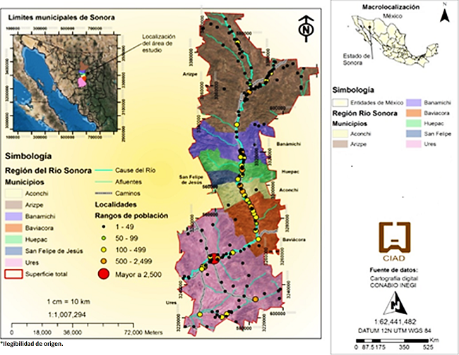 Al borde de la cuenca del río Sonora, considerada el corazón del estado y un espacio donde se conforma la identidad y cultura de una buena parte de los sonorenses (Salido et al., 2010) se encuentra la región Río Sonora, localizada al centro de la entidad. Partiendo de la ciudad de Hermosillo, capital estatal, la principal entrada de acceso es el municipio de Ures, siguiendo una cadena montañosa y de forma ascendente continúan Baviácora, Aconchi, San Felipe de Jesús, Huépac, Banámichi, Bacoachi, para finalizar en Cananea (Figura 1). En conjunto, estos municipios comprenden una superficie total de 13,418 km2 y con una población de alrededor de 22 mil habitantes (Conagua, 2015).