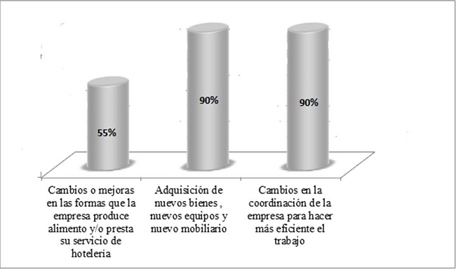 En el caso de las empresas dedicadas a la preparación de alimentos, los empresarios mencionaron la adquisición de equipos como cuarto refrigerado, cocina industrial, molino eléctrico, nuevo inmobiliario (mesas, sillas y artículos decorativos); también hablaron sobre la adquisición de software para mejorar sus sistemas de cobro. En lo que respecta a los establecimientos de hospedaje, las innovaciones consistieron en nuevo equipamiento para el cuidado y conservación de instalaciones, nuevo sistema de cámaras de seguridad e instalación de paneles solares, así como terminales para cobro a tarjetas de débito y crédito. El realizar estas innovaciones permitió una disminución en costos de operación y tiempos en la atención al cliente en áreas de espera.