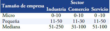 En México, la Ley para el Desarrollo de la Competitividad de la Micro, Pequeña y Mediana Empresa (DOF, 2011), destaca que las MIPYMES son “Micro, Pequeñas y Medianas empresas, legalmente constituidas, con base en la estratificación establecida por la Secretaría de Economía, de común acuerdo con la Secretaría de Hacienda y Crédito Público” (DOF, 2011:1). Para su clasificación es posible estratificarlas de acuerdo al número de trabajadores que en ellas operan o laboran (Tabla 1).