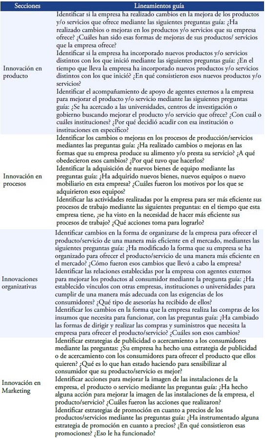 Para el levantamiento de información se aplicó una entrevista semiestructurada al propietario o gerente de cada una de las empresas. Este instrumento fue una adaptación del presentado, anteriormente, por Zúñiga (2015) y se tomó como base la conceptualización y tipología de la innovación descrita en el Manual de Oslo (OCDE, 2005). Se estructuró en cuatro secciones: a) innovación en producto; b) innovación en procesos; c) innovaciones organizativas e d) innovaciones en marketing (ver AnexoTabla 2). Es importante resaltar que el instrumento se adaptó para aplicarlo al contexto de la micro y pequeña empresa rural. Lo anterior, se considera es parte de la originalidad y de la aportación de este trabajo, ya que, en la mayoría de los casos de estudios empíricos, el análisis se realiza en empresas grandes ubicados en un contexto urbano.