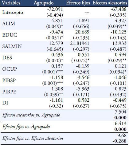 El primer paso consiste en seleccionar el mejor modelo de panel (efectos fijos, aleatorios o agrupado). La Tabla 1 exhibe las diferentes estimaciones que permiten identificar el mejor modelo. Mediante el Multiplicador de Lagrange, se observa que efectos aleatorios es preferible al resto de los modelos.