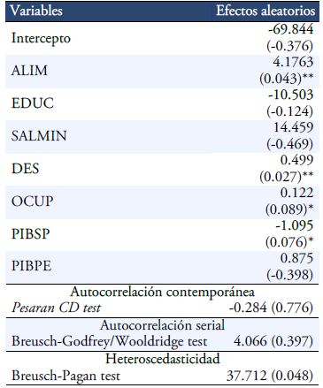 Mediante este proceso iterativo se agregó el PIBSP como variable estadísticamente significativa y se eliminó DI (al ser la menos significativa). Una vez encontrado el modelo más adecuado realizamos las pruebas de especificación las cuales permiten descartar o identificar autocorrelación contemporánea, autocorrelación serial y heteroscedasticidad (ver Tabla 2). Para identificar problemas de correlación contemporánea en los residuales, se aplicó el test de Pesaran CD. La hipótesis nula plantea que existe independencia transversal, es decir, que los errores entre las unidades son independientes entre sí, si dicha hipótesis se rechaza, entonces existe un problema de correlación contemporánea (Torres, 2010). En este caso, el valor-p de la prueba es de 0.78, por lo que no se rechaza la hipótesis nula de no autocorrelación contemporánea. En el caso de la autocorrelación serial, Breusch-Godfrey/Wooldridge desarrollaron una prueba bajo la hipótesis nula de que no existe autocorrelación serial (Aparicio y Marquez, 2005). Al aplicar la prueba al modelo no se rechaza la hipótesis nula de no correlación serial, se tiene un p-valor de 0.397.