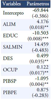 Si consideramos la magnitud de su coeficiente, las variables que más peso tienen en el modelo son la educación (EDUC), el INPC en alimentos (ALIM) y el PIB en el sector primario (PIBSP). En este sentido, se confirma que las personas más capacitadas tienen mayores posibilidades de alejarse del problema de la IAS, sea porque tiene mejores oportunidades de ocuparse en empleos de mejor calidad, o cuenta en general, con mejores habilidades y capacidades para generar mayores niveles de ingreso.