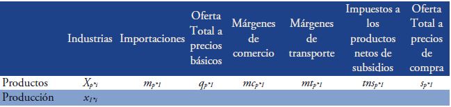 La identidad expresada en 1 es reformulada en 2 para precisar cada uno de sus componentes. En el lado izquierdo se encuentran los elementos del cuadro de oferta, donde es la matriz de oferta doméstica a precios básicos, el vector de importaciones en valores CIF,2mcp*1, mtp*1 y tnsp*1 , son los vectores de márgenes de comercio, de transporte, e impuestos a los productos netos de subsidios, respectivamente. En el lado derecho están los elementos del cuadro de utilización valorados a precios de comprador;3 es la matriz de usos intermedios, el vector de consumo privado, el vector de consumo de gobierno, el vector de formación bruta de capital fijo y el vector de exportaciones.