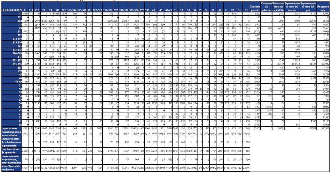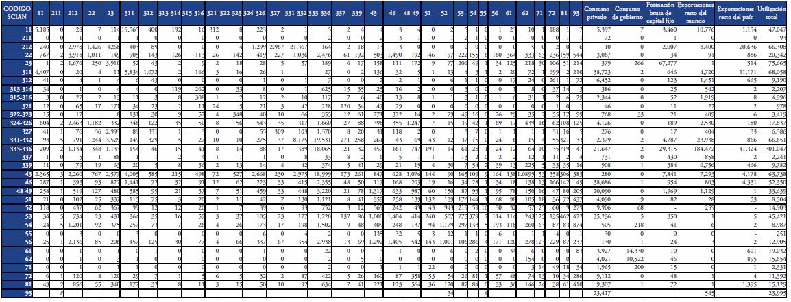 Por su parte, el cuadro de utilización es una tabla estadística que muestra los destinos de los bienes y servicios disponibles en la economía, ya sea como producción para usos intermedios de las industrias, o bien, para usos finales de consumo, formación bruta de capital o exportaciones. También lleva el registro de los componentes del valor agregado por industria, tales como, las remuneraciones de asalariados, impuestos netos de subsidios sobre la producción y excedente bruto de operación (EUROSTAT, 2008).
