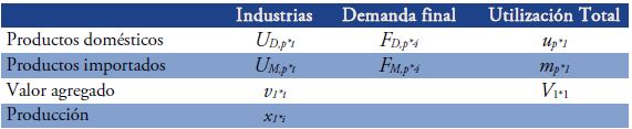 Donde UD,p*i es la matriz doméstica de usos intermedios, FD,p*4 es la matriz doméstica de usos finales, Up*i es la matriz de usos intermedios y Fp*4 la matriz de usos finales.6