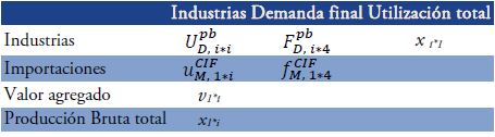 En una lectura vertical, la suma por columnas del primer bloque denota el consumo intermedio doméstico ciD,1*i , la suma por columnas del tercer bloque es el consumo intermedio importado ciM,1*i y la suma por columnas del quinto bloque V3*i corresponde al valor agregado total por industrias v1*i , que en conjunto resultan en el valor bruto de la producción x1*i. Esta lectura vertical a través de cada una de las columnas refleja la estructura de costos de la economía, puesto que muestra cómo las “i” industrias combinan los “p” productos y “v” insumos primarios para llevar a cabo sus procesos de producción.