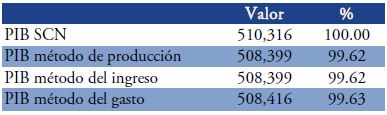 Finalmente, para verificar la consistencia estadística de los resultados, se ha corroborado si el valor del PIB que resulta de la información del marco IP es consistente con los datos del PIB observado en el SCN. Los COU reúnen los componentes de cada uno de los tres enfoques para medir el PIB,