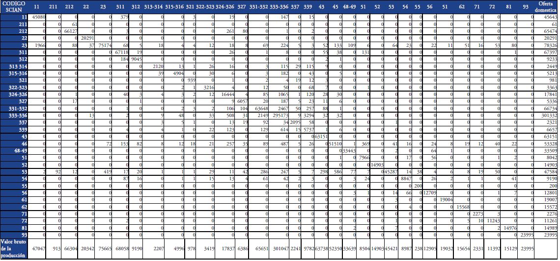 La matriz de oferta doméstica Xp*1 es un arreglo rectangular que en las filas describe la oferta de “p” productos y en las columnas muestra las “i” industrias que los producen, sobre la diagonal principal se encuentra la actividad primaria o principal que realizan las industrias, mientras que fuera de ésta se registran las producciones secundarias. El resultado de la suma por filas Xp*1ii*1 representa la oferta doméstica total de la economía a precios básicos xp*1, mientras que la suma por columna corresponde al valor bruto de la producción a precios básicos x1*i.