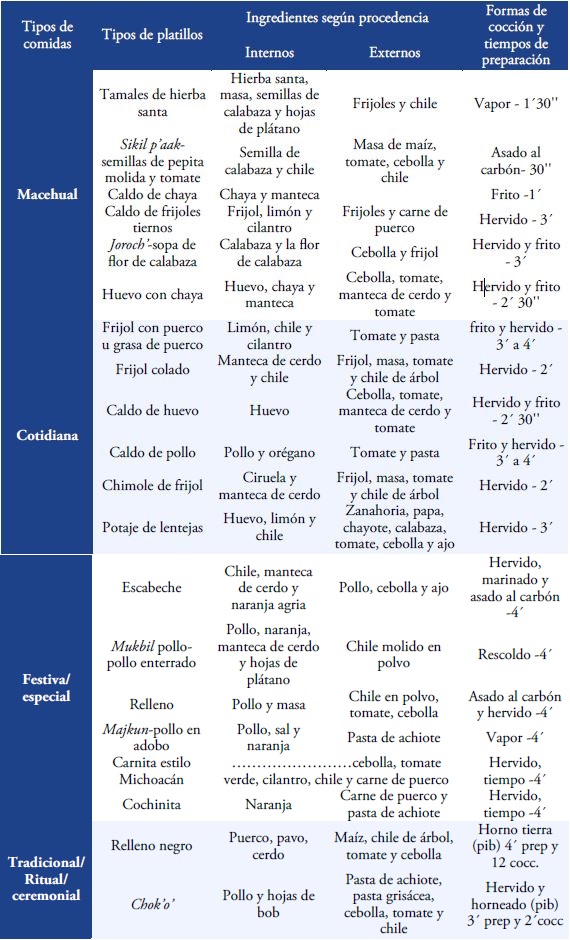 De acuerdo con los estudios realizados por Sánchez, Estrada, Arce y Martínez (2011) en comunidades mayas de Quintana Roo, la comida cotidiana es aquella que se elabora y se consume a diario, sus insumos son locales y externos y, por lo general, sus platillos son menos elaborados. A diferencia de la comida cotidiana, la comida especial se prepara para conmemorar reencuentros y reafirmar las relaciones sociales con los demás integrantes del grupo. Para la preparación de esta comida los productos son obtenidos de forma local y también externamente; usualmente, este tipo de comidas llevan carnes de aves como pavos o gallinas; esta comida se distingue por la laboriosidad en su preparación (Unigarro, 2010). Finalmente, la comida ritual o ceremonial se relaciona con las actividades agrícolas e involucra ofrendas que se hacen en honor a patronos y deidades del monte, por lo que requiere la organización de hombres y mujeres en la preparación del platillo y los recados. Los insumos para su elaboración habitualmente son externos y usados en grandes cantidades (Sánchez et al., 2011). La comida ritual o ceremonial es realizada para una gran celebración y sigue siendo la más preciada para la cultura local dada su historicidad y relación con el sistema milpa (Good, 2013). Esta comida simboliza una resistencia cultural en respuesta a la penetración de las grandes empresas que ofrecen productos industrializados (De Jong, 2004), pues al incorporarlos y adaptarlos a sus preparaciones culinarias van diseminando la cocina tradicional en espacios sociales marginales (Scott, 2013).