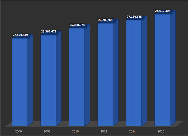 Es pertinente destacar que el costo de los refrigeradores representa una fuerte carga económica para la mayoría de los hogares de México en virtud de que aproximadamente 50 % de la población vive en situación de pobreza (Coneval, 2018). Para mitigar la problemática, la Secretaría de Energía implementó, en 2009, el Programa de Sustitución de Equipos Electrodomésticos para el Ahorro de Energía Eléctrica, conocido como cambia tu viejo por uno nuevo, consistente en facilitar la sustitución de refrigeradores con más de diez años de uso por equipos nuevos y eficientes. De acuerdo con INEGI (2018) se han beneficiado hasta ahora 1,555,184 hogares con ese programa. Con los elementos indicados es posible, decir que la aplicación de NDEM en refrigeradores del sector residencial trae consigo impactos significativos tanto económicos como energéticos y ambientales. Los impactos adquieren mayor relevancia si se considera el incremento de refrigeradores que registran los hogares mexicanos: entre 2006 y 2016 aumentó 27 %, al pasar de 22,479,849 a 28,612,308 respectivamente (Gráfico 1).