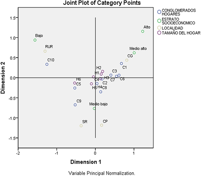 Identificados los 10 grupos de hogares, el siguiente paso consistió en analizar su caracterización social y económica para lo cual se aplicó el modelo ACM. El Cuadro 6 sintetiza los hallazgos registrados; se observa que las dos dimensiones del plano factorial contribuyen con 82.1 % de la varianza total. El Gráfico 2 muestra al respecto el plano factorial con la ubicación de las categorías de las cuatro variables utilizadas en el análisis de correspondencias. En primer lugar, se observa que la primera dimensión o eje de las abscisas (eje X) explica 48.1 % de la varianza total (Cuadro 6). Esta dimensión discrimina los valores extremos de las variables Conglomerados, Localidad y Estrato socioeconómico, como se muestra en el Gráfico 2 donde las categorías C1 (de conglomerados de hogares), Alto y Medio alto (estrato socioeconómico) y CG (localidades urbanas con 100 mil o más habitantes) se encuentran a la extrema derecha de la primera dimensión (eje X o eje de las abscisas); mientras que las categorías C10 (conglomerado de hogares que no tienen refrigerador), estrato socioeconómico BAJO y localidades RUR (rurales con población hasta 2,499 habitantes) se encuentran a la extrema izquierda de esta dimensión.