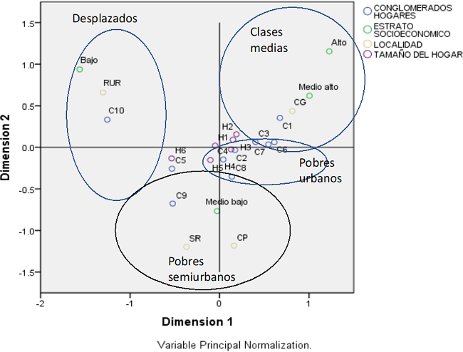 Enseguida se identifica un patrón de relaciones que corresponde principalmente al tercer y cuarto cuadrante, caracterizado por hogares de estrato medio bajo (Medio bajo), ubicados en localidades semirurales (SR) y en menor medida ciudades pequeñas (CP), con refrigeradores que pertenecen a las categorías C9 y C8. Este grupo denominado Pobres semiurbanos, se forma de 1,444,090 hogares representando 4.4 % del total. Después se encuentra un grupo conformado por 1,251,956 hogares (3.8 % del total) que nombraremos Pobres urbanos, que son de estrato medio bajo y se localizan en ciudades pequeñas (CP) y ciudades grandes (CG). Estos hogares tienen en su mayoría refrigeradores categorizados como C6, C7 y C8. Por último, está el grupo denominado Clases medias integrado por 1,115,242 hogares (3.4 % del total). Estos pertenecen a los estratos socioeconómicos alto y medio alto; son esencialmente urbanos y sus refrigeradores pertenecen también a las categorías C6, C7 y C8.