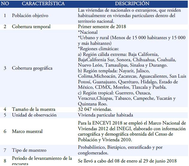 Se utiliza como fuente de información la Encuesta Nacional sobre Consumo de Energéticos en Viviendas Particulares (ENCEVI 2018) del Instituto Nacional de Estadística y Geografía de México (INEGI, 2018). Cabe destacar la importancia histórica de este instrumento, ya que es la primera encuesta realizada en México que mide cl consumo de energía y las características de los principales equipos y enseres electrodomésticos en las viviendas. Las características principales de la ENCEVI 2018 se resumen en el Cuadro 1.