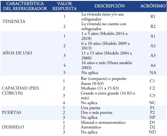 Por último, la identificación, caracterización y tipología de los grupos de hogares privados de refrigeradores energéticamente eficientes, significa una advertencia para reconocer la heterogeneidad de los hogares en términos económicos, sociales y territoriales. Esta evidencia empírica representa también un insumo para diseñar e implementar políticas públicas y programas diferenciados en función de dicha heterogeneidad. Además de la tipología propuesta en este trabajo con base en variables eminentemente cuantitativas, se requiere el abordaje de este tema con otras perspectivas metodológicas. Sería valioso el aporte de la sociología y la antropología para investigar aspectos tales como el significado social y cultural o nivel de estatus social que implica la adquisición de un determinado equipo, por ejemplo, la elección de un refrigerador de determinado tamaño, capacidad, número de puertas o tipo deshielo.