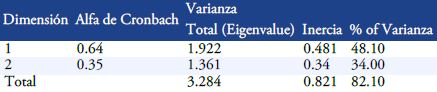 La segunda dimensión o eje de las ordenadas (eje Y), por su parte, explica 34 % de la varianza total y discrimina los valores extremos (altos y bajos) de los valores medios de las variables Localidad y Estrato socioeconómico. En el caso del estrato socioeconómico, la categoría Medio bajo se encuentra en la parte inferior del origen y casi toca el eje Y, es decir, su valor en el eje X se aproxima a cero, mientras que los valores extremos Bajo y Alto se encuentran en la parte superior. En lo que respecta al tamaño de localidad, la categoría SR que corresponde a localidades semirurales de 2,500 a 14,999 habitantes, así como la categoría CP vinculada a ciudades pequeñas de 15,000 a 99,999 habitantes, se encuentran en la parte inferior del origen; mientras que los valores extremos RUR y CG se ubican en la parte superior.
