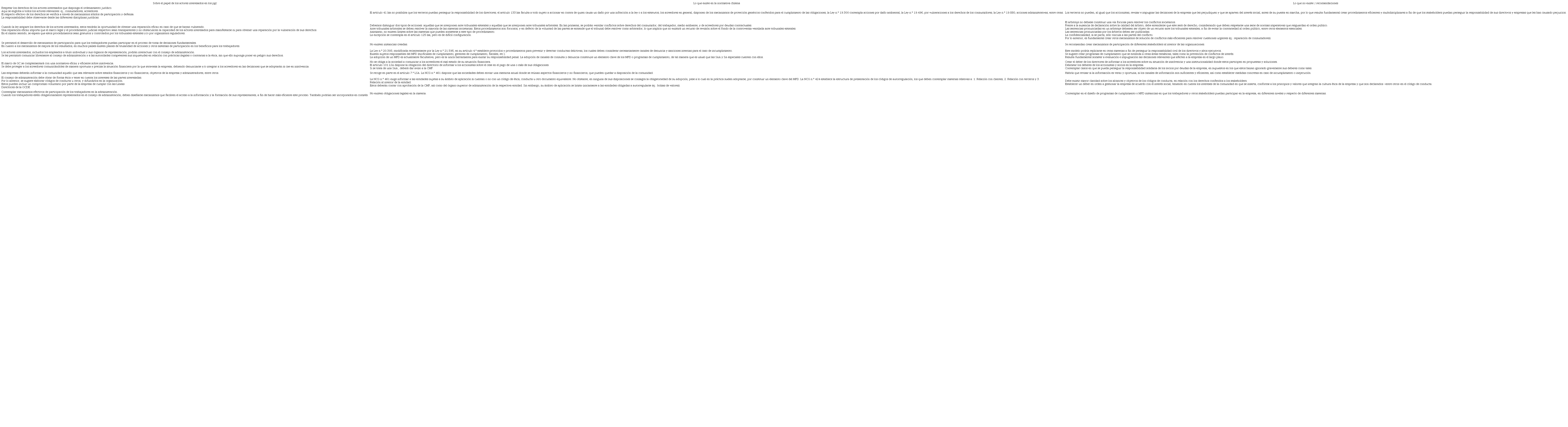 Con el objeto de lograr una comprensión cabal de esta materia, contrastaremos lo que ha señalado la OCDE en los PGC, con la normativa chilena, a fin de evidenciar si esta recoge algunas de las aristas contempladas en tales principios en relación con los actores interesados, y en caso de ser así, de qué forma, o si, por el contrario, existe un vacío que debiese ser objeto de mayor atención. No se trata de un elenco exhaustivo, pero sirve de referencia y análisis.