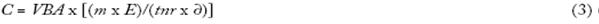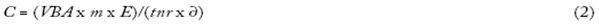 El problema de la ecuación 1 es que las ganancias oscilan violentamente, de modo que para fines de predicción conviene tomar un atajo simplificador. En vez de estimar directamente la ganancia futura, los capitalistas y analistas suelen comenzar con el valor total de la producción en dólares, o valor bruto agregado, vba, y luego hacen dos conjeturas. Mirando hacia el futuro profundo, proyectan que 1) VBA crecerá a una tasa promedio del 5%, por ejemplo; y 2) que la participación de la ganancia en vba oscilará alrededor de cierto promedio, por ejemplo, el 6%. Uniendo estas dos conjeturas en un coeficiente m, pueden obtener la capitalización de mercado observando a VBA y m en vez de E; el coeficiente de exageración E denota su optimismo/ pesimismo excesivo con respecto a la magnitud de m. Este nuevo cálculo se muestra en la ecuación 2: