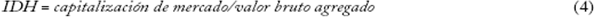 Comencemos con la irracionalidad. Si los capitalistas y analistas fueran perfectamente racionales y totalmente clarividentes, el elemento de cuatro componentes del lado derecho de la ecuación 3 sería un número fijo, la capitalización de mercado fluctuaría en paralelo con el valor bruto agregado e idh trazaría una línea recta horizontal igual al promedio histórico del índice. Así debería ser en un mundo perfectamente ajustado.