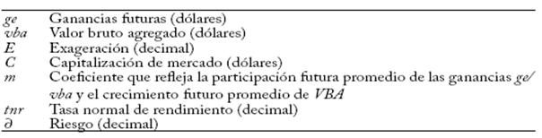 Nuestra lógica se puede resumir como sigue. La capitalización es prospectiva: según el gurú de la valoración Benjamin Graham, no se deben descontar las ganancias corrientes sino las ganancias que se obtendrán en el futuro, en el camino a la "eternidad" (citado en Zweig, 2009, 28). En este esquema, las variaciones actuales de las ganancias solo tienen un impacto insignificante en el resultado final. Y, de hecho, si se revista la ecuación 3, se verá que la capitalización depende del coeficiente m, que a su vez depende de la participación promedio de las ganancias futuras en vba y de la tasa media de crecimiento futura de vba. Las ganancias corrientes ni siquiera figuran en la ecuación.