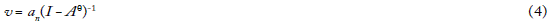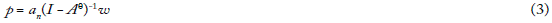 Finalmente, ω denota el vector fila de los salarios. En consecuencia, an (I - Aθ)-1 hace referencia a un vector cuyos componentes se obtuvieron como el producto escalar de an multiplicado por su correspondiente columna de (I - Aθ)-1.