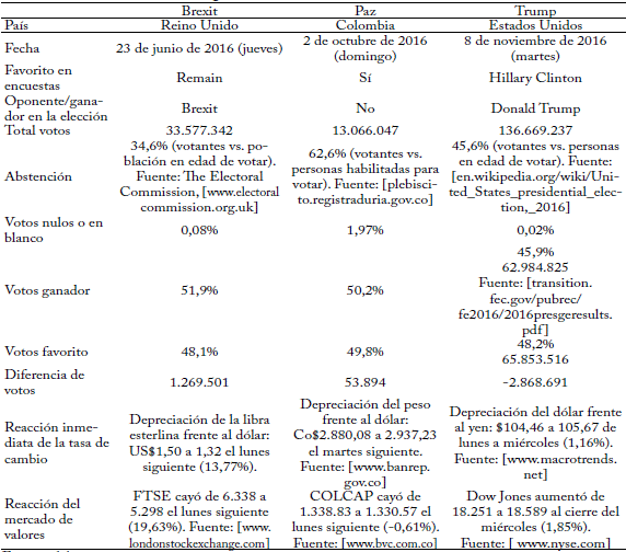 Abstract. This essay analyzes three elections that had unexpected results: the exit of the United Kingdom from the European Union, the rejection of the peace agreement in Colombia and the election ofTrump as president of the United States. It emphasizes three aspects: the predictions were made in a situation of uncertainty based on rules or conventions, the campaigns involved strong emotional elements and the results were affected by cultural factors (identity and religious) and not only economic ones. Standard economics omits such factors although it should take them into account. JEL: A12, D84, D87, D91.