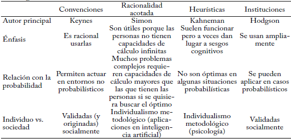 Otras diferencias se refieren al papel del individualismo metodológico en la racionalidad acotada y las heurísticas, en contraste con el elemento social que tienen las convenciones y las instituciones. Finalmente, las heurísticas parten de una ontología probabilística, es decir, el investigador imagina de entrada que el mundo es probabilístico; mientras que las convenciones keynesianas y las instituciones parten de una ontología de incertidumbre radical, es decir, el investigador parte de concebir un mundo que no es probabilístico.