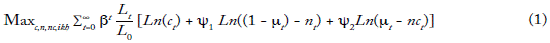 donde β es el factor de descuento; Lt la cantidad de personas en edad de trabajar (población en edad de trabajar); ct el consumo per cápita; nt la cantidad de trabajo per cápita no calificada; (1 - µt) la cantidad de población no calificada y nct la cantidad de trabajo per cápita calificada. Ahora bien, la dinámica de calificación educativa que siguen las familias está definida por un proceso de Markov, de la forma p(Xn+1 = sj. | Xn = si) = pij ∀, n = 1,2, en el que cada uno de los estados sj. define la matriz de transición de ser no calificado a ser calificado, así: