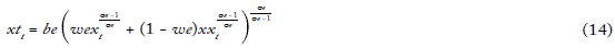 donde xtt designa las compras totales en el mercado internacional, y be, we y σe indican los parámetros de escala, participación y sustitución en la función de agregación mundial, respectivamente. Análogamente, la senda de expansión es: