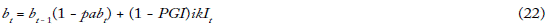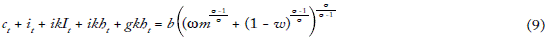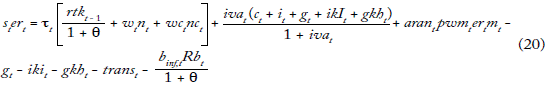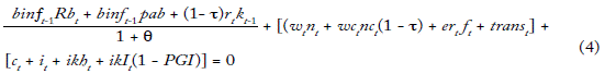 donde binf,t son los bonos en infraestructura;pab corresponde a la amortización de los bonos emitidos; Rbt es la rentabilidad de los bonos de infraestructura; τ la tasa de impuestos directos; rt la remuneración real al capital; kt el stock de capital; wt los salarios reales no calificados; wct los salarios reales calificados; ert la tasa de cambio nominal (asumimos tipo de cambio flexible y sin intervención por parte del banco central); ft las remesas recibidas del exterior; transt las transferencias sociales del gobierno a las familias; it, ikht, ikIt la inversión neta, la inversión en capital humano y la inversión en capital en infraestructura; PGI la participación pública en inversión de infraestructura3.