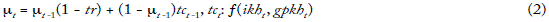 El proceso de calificación de las familias se especifica con el mecanismo de transición descrito en la ecuación 2. El primer elemento define la probabilidad de permanecer calificados en el mercado laboral, es decir, conservar el stock de oferta laboral educada en el periodo anterior. A partir de la tasa bruta de mortalidad correspondiente al grupo etario de la población en edad de trabajar se define la tasa de retiro (tr), como la proporción de individuos que pasan de ser activos a inactivos.