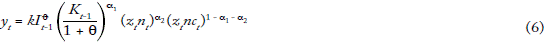 donde yt es la producción total que contiene bienes y servicios para la venta doméstica y del resto del mundo; kIθt-1 es el capital en infraestructura; zt la productividad; los parámetros α1, α 2 corresponden a la participación del capital y el trabajo en la producción, respectivamente. La senda de capital en infraestructura evoluciona de acuerdo con: