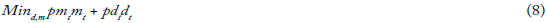 donde pmt es el precio de las importaciones en moneda nacional, mt las importaciones, pdt el precio de la producción nacional doméstica reservada al mercado nacional y dt las ventas de producción doméstica en el mercado nacional. Así, en este rubro la restricción corresponde a: