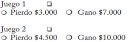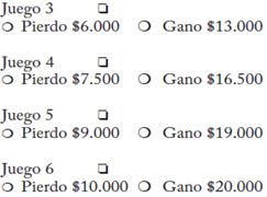 En la bolsa tenemos una bola blanca y una bola negra. Vamos a sacar una de las dos bolas al azar. Abajo tenemos 6 juegos donde Ud. puede ganar una cantidad diferente según la bola que salga. ¿Qué juego le gustaría jugar? Márquelo con una X en la casilla al lado del título
